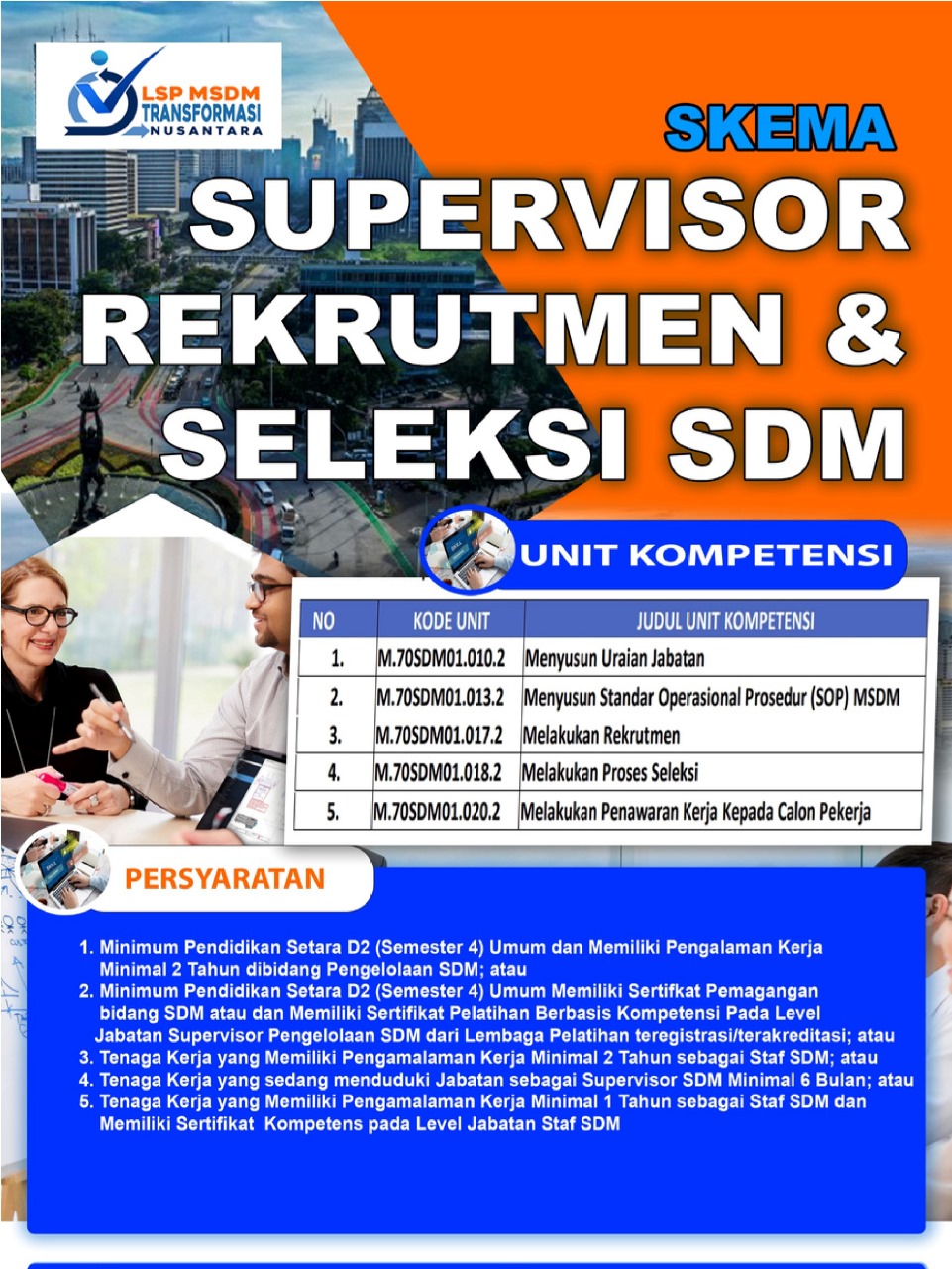 LSP MSDM Transformasi Nusantara adalah sebuah Lembaga sertifikasi Profesi, lembaga pendukung BNSP yang bertanggung jawab melaksanakan sertifikasi kompetensi profesi yang teregistrasi oleh BNSP. LSP MSDM Transformasi Nusantara mendapatkan Lisensi Nomor BNSP-LSP-2495-ID sesuai dengan Surat Keputusan BNSP No. KEP. 2324/BNSP/IX/2024 tentang Lisensi kepada LSP MSDM Transformasi Nusantara.